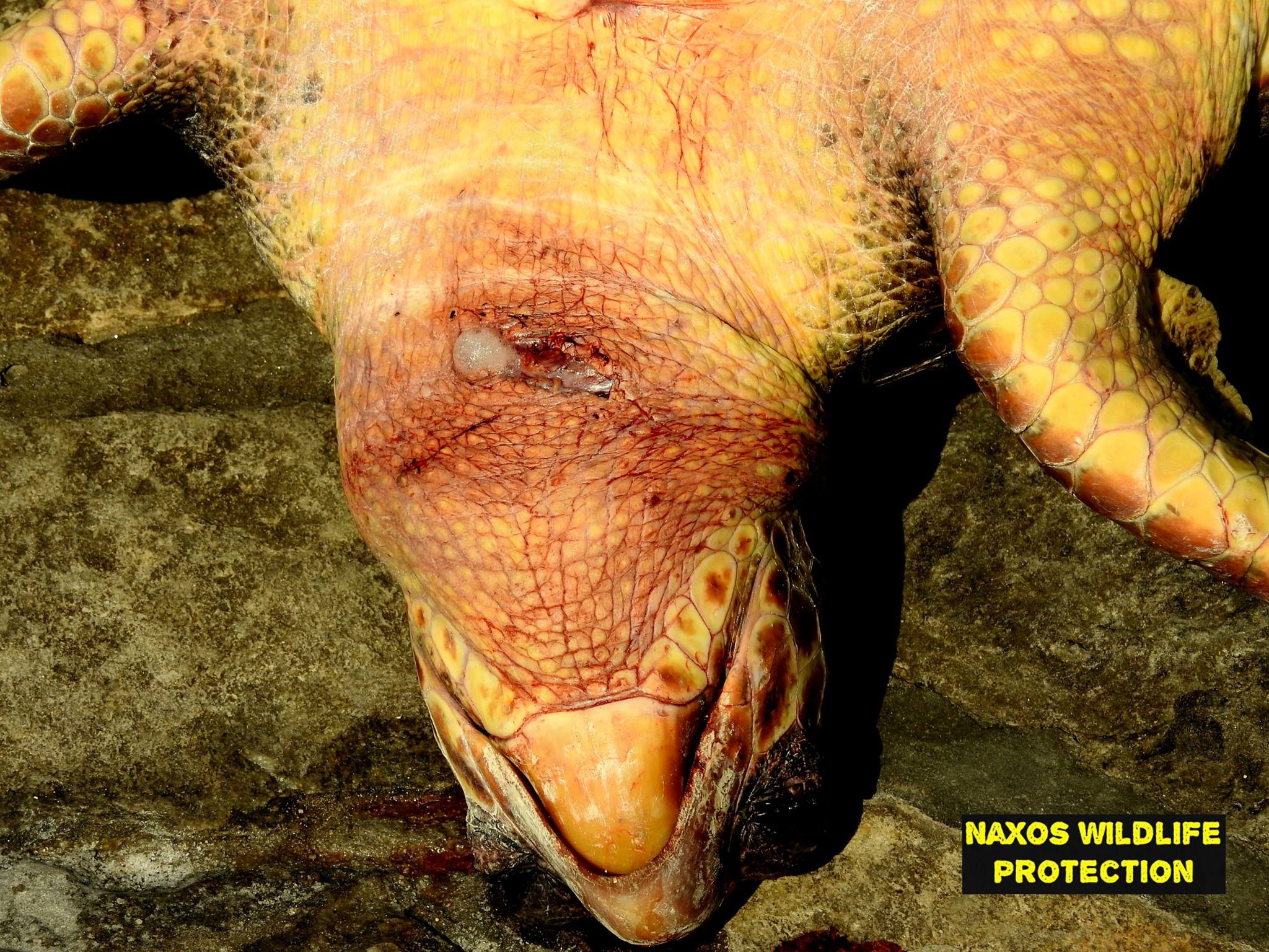 Το άτυχο ερπετό, βρέθηκε από κολυμβητές στη θάλασσα, με δίχτυα στα πτερύγια και εμφανές το τραύμα από μαχαίρι στον λαιμό.