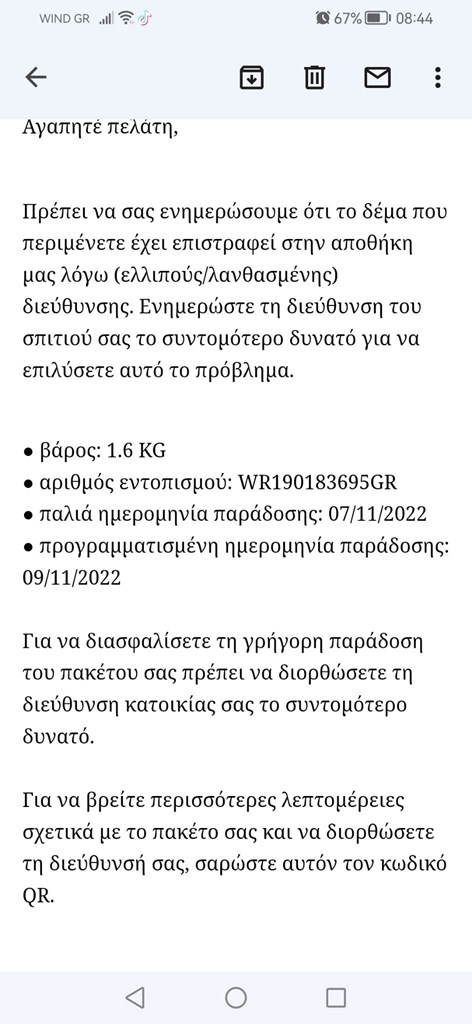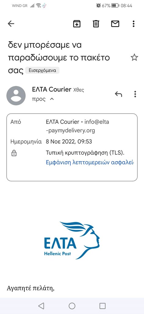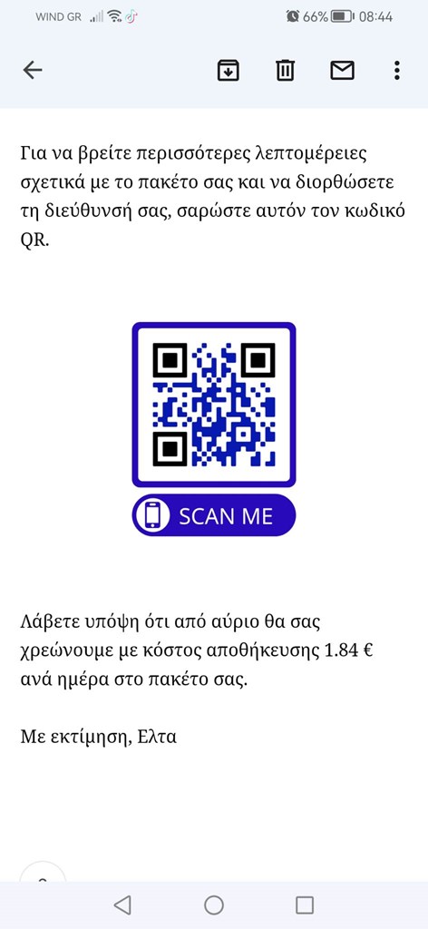 Αναγνώστρια της «Ζούγκλας» καταγγέλλει περιστατικό απάτης – email με φερόμενο αποστολέα «ΕΛΤΑ courier» και με την πρόφαση ότι πρόκειται για πακέτο που πρέπει να παραλάβει από την αποθήκη λόγω λανθασμένη διεύθυνσης. Το email που ακολουθεί την παρότρυνε να κάνει scan ένα κωδικό, ώστε να επιβεβαιώσει την παραλαβή ενός πακέτου μέσω ψευδών συνδέσμων (link). Μάλιστα αν δεν ακολουθούσε τις οδηγίες, το email ισχυριζόταν, πως η γυναίκα θα χρεωνόταν 1,84 ευρώ την ημέρα.