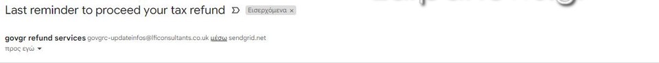 Στα email εμφανίζεται ως αποστολέας το govgr refund services, λογαριασμός που παραπέμπει στην ελληνική κυβέρνηση, ωστόσο ανήκει σε απατεώνες, ενώ φυσικά τα μηνύματα επιστροφής φόρου τα στέλνει η ΑΑΔΕ και όχι η κυβέρνηση, κάτι που οφείλει να υποψιάσει αυτομάτως τον αποδέκτη.