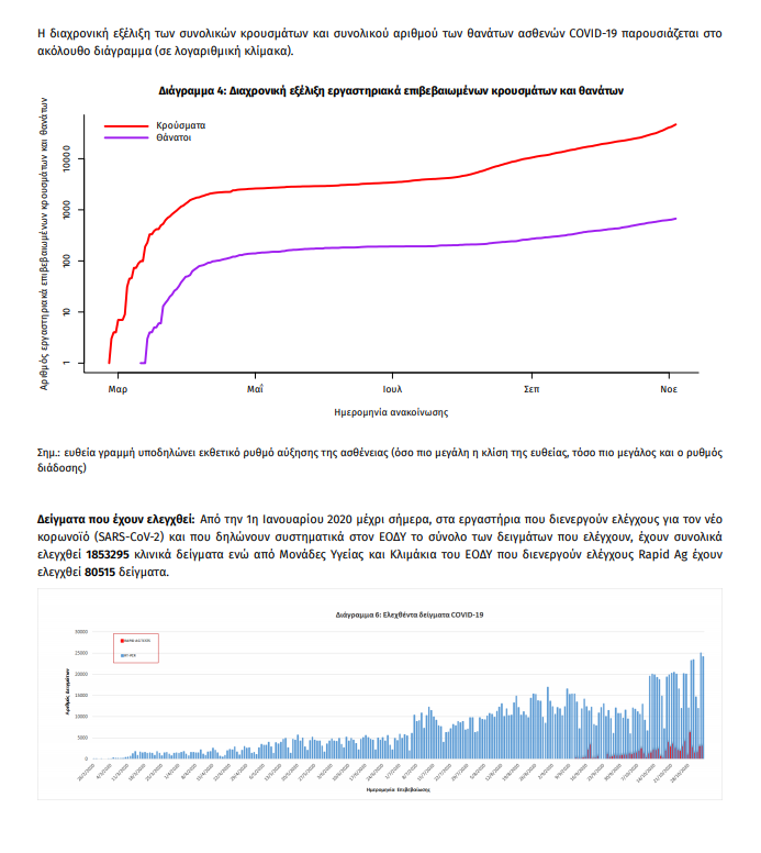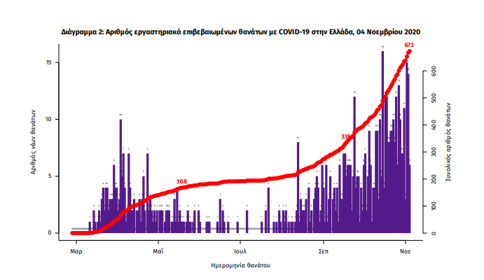 Τέλος, έχουμε 18 ακόμα καταγεγραμμένους θανάτους και 673 θανάτους συνολικά στη χώρα. 259 (38.5%) γυναίκες και οι υπόλοιποι άνδρες. Η διάμεση ηλικία των θανόντων συμπολιτών μας ήταν τα 79 έτη και το 96.4% είχε κάποιο υποκείμενο νόσημα ή/και ηλικία 70 ετών και άνω.