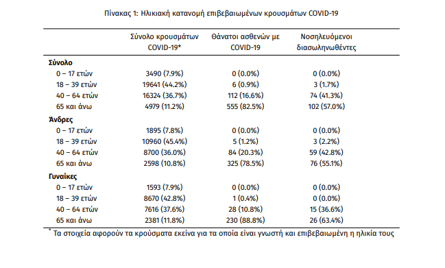 Από το σύνολο των 46892 κρουσμάτων, 4271 (9.1%) θεωρούνται σχετιζόμενα με ταξίδι από το εξωτερικό, 14427 (30.8%) είναι σχετιζόμενα με ήδη γνωστό κρούσμα και τα υπόλοιπα δεν σχετίζονται ούτε με ταξίδι ούτε με άλλο γνωστό κρούσμα ή είναι ακόμα υπό διερεύνηση. Η μέση ηλικία των κρουσμάτων είναι 38 έτη (εύρος 0 έως 103 ετών), ενώ η μέση ηλικία των θανάτων είναι 79 έτη (εύρος 25 έως 103 ετών). Η ηλικιακή κατανομή των (α) συνολικών κρουσμάτων, (β) των περιστατικών που κατέληξαν σε θάνατο και (γ) των ασθενών που νοσηλεύονται διασωληνωμένοι, είναι η ακόλουθη: