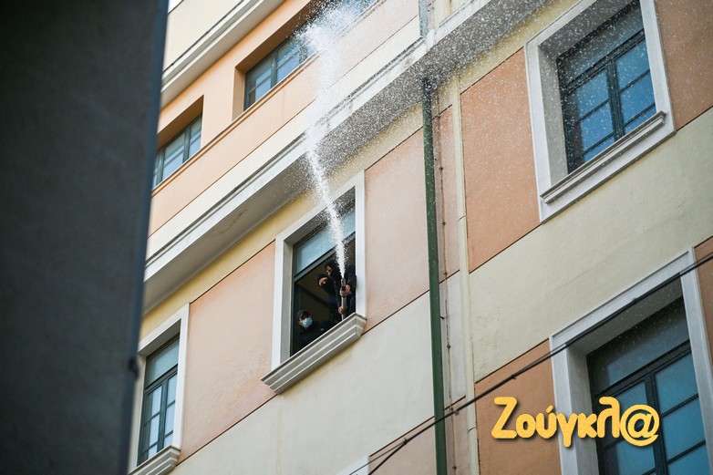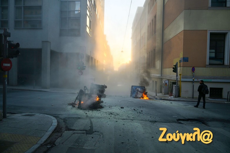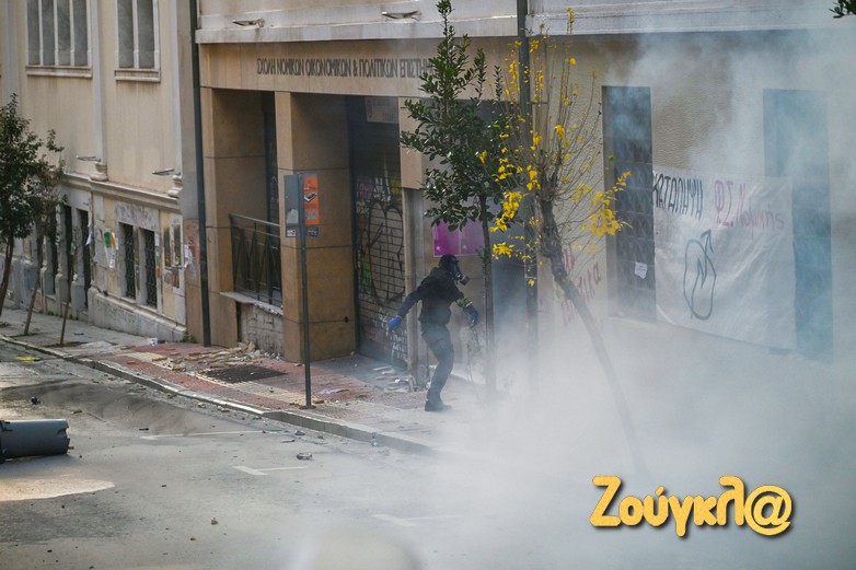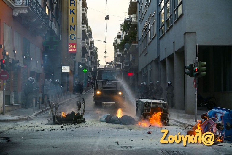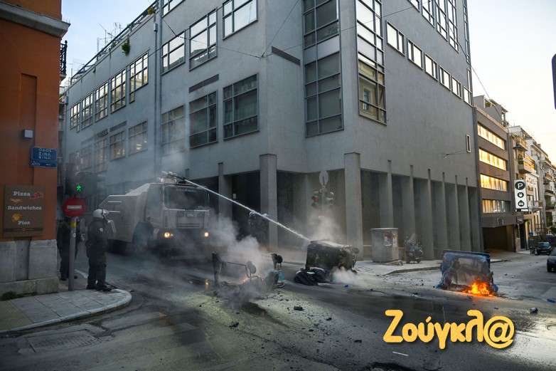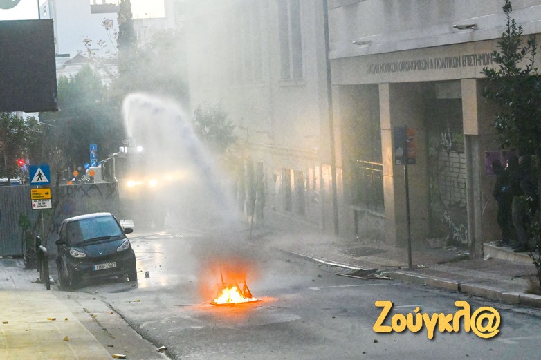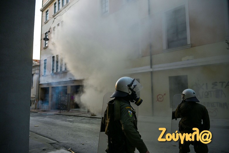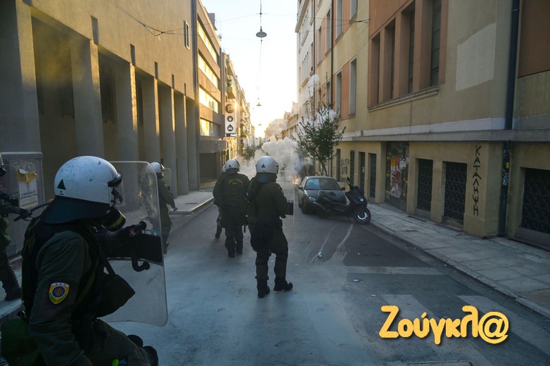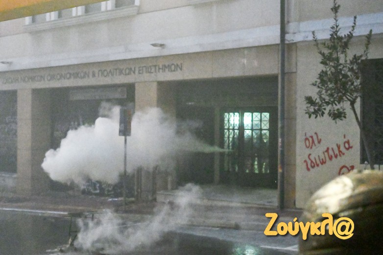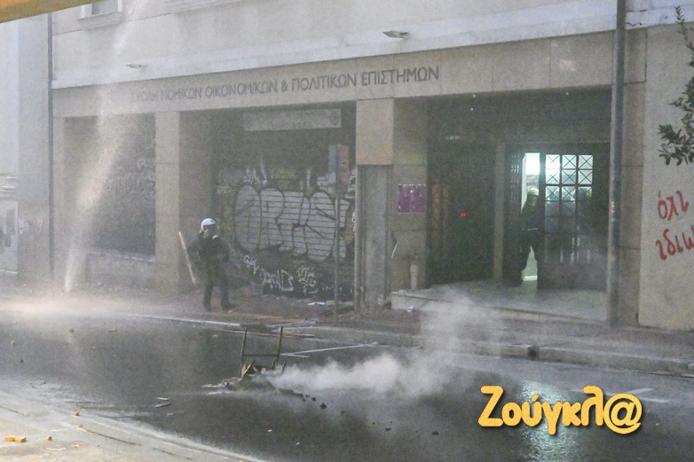 Άγνωστοι πετούν μολότοφ προς τις αστυνομικές δυνάμεις οι οποίες απαντούν με χημικά στη συμβολή των οδών Σόλωνος και Σίνα έξω από τη Νομική Σχολή. Στη συνέχεια κατέφθασαν «Αύρες» της αστυνομίας για να κατασβήσουν τις φωτιές στους κάδους.