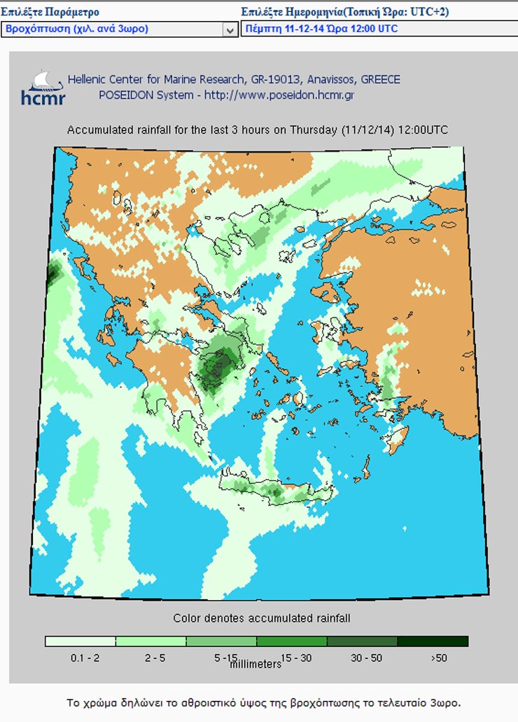 Δείτε την πρόγνωση βροχοπτώσεων του συστήματος Ποσειδών για το μεσημέρι της Πέμπτης: