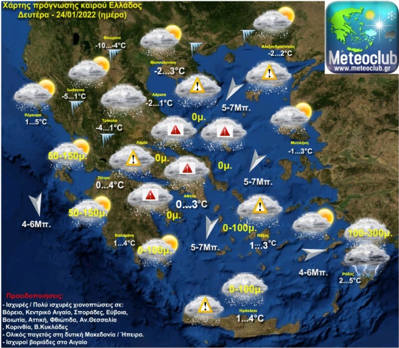 Συνιστάται ιδιαίτερη προσοχή από το πρωί της Δευτέρας σε Σποράδες – Εύβοια και Ανατολική Θεσσαλία και έπειτα σε Αττική – Βοιωτία – Κορινθία – Φθιώτιδα από τις πρώτες μεσημβρινές ώρες της ίδιας ημέρας, καθώς αναμένονται έντονα φαινόμενα χιονοπτώσεων έως και σε μηδενικό υψόμετρο.