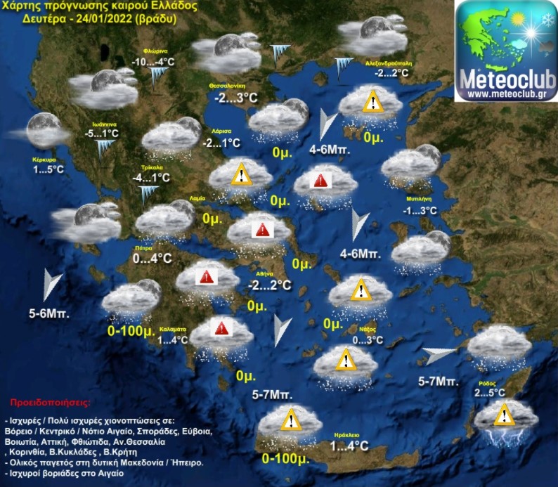 Έντονες χιονοπτώσεις θα σημειώνονται από τις πρώτες πρωινές ώρες στη νότια Χαλκιδική, στις Σποράδες, στην Ανατολική Μαγνησία και πιθανόν στα ανατολικά τμήματα του Νομού Λάρισας και Πιερίας, στη Βόρεια – Ανατολική και Κεντρική Εύβοια, και έως το πρωί της Δευτέρας τα φαινόμενα θα αποκτήσουν ιδιαίτερα έντονα χαρακτηριστικά και για το υπόλοιπο της ημέρας.