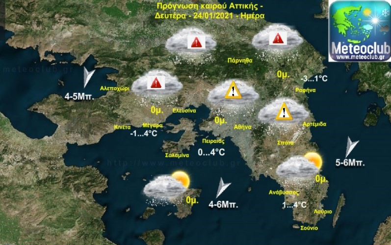 Από νωρίς το πρωί της Δευτέρας αναμένονται πυκνές νεφώσεις στη βόρεια Αττική με παροδικές χιονοπτώσεις έως και τα παραθαλάσσια τμήματα. Τοπικά νεφελώδης καιρός στα υπόλοιπα τμήματα με διαστήματα ηλιοφάνειας μέχρι και λίγο πριν τις μεσημβρινές ώρες.