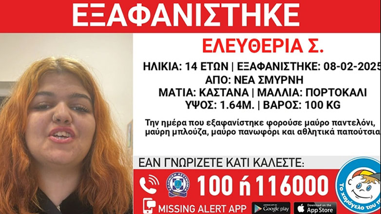 Συναγερμός έχει σημάνει στη Νέα Σμύρνη για την εξαφάνιση της 14χρονης Ελευθερίας Σ., τις απογευματινές ώρες του Σαββάτου (8/2) από χώρο φιλοξενίας.