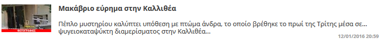 Ταυτοποιήθηκαν μετά τη νεκροψία-νεκροτομή τα στοιχεία του άνδρα που βρέθηκε νεκρός μέσα σε ψυγειοκαταψύκτη, την περασμένη Τρίτη στην Καλλιθέα, σε διαμέρισμα επί της οδού Ευαγγελιστρίας.
