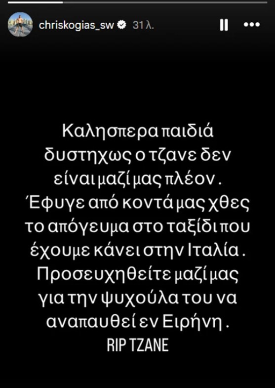 «Δυστυχώς, ο Τζάνε δεν είναι μαζί μας πλέον. Έφυγε από κοντά μας χθες το απόγευμα στο ταξίδι που έχουμε κάνει στην Ιταλία. Προσευχηθείτε μαζί μας για την ψυχούλα του να αναπαυθεί εν ειρήνη» έγραψε.