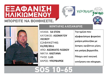 Νεκρός εντοπίστηκε τελικά ο αγνοούμενος άνδρας Αλέξανδρος Κοντάρας από τη Μυτιλήνη, ο οποίος είχε εξαφανιστεί από την 1η Σεπτεμβρίου και αναζητούνταν εκτός από την αστυνομία και από τη Μη Κυβερνητική Οργάνωση «Γραμμή Ζωής».