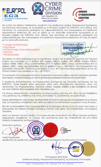 Μάλιστα, στην προσπάθειά τους να προσδώσουν αληθοφάνεια στη σχετική επιστολή, χρησιμοποιούν τα λογότυπα της Ελληνικής Αστυνομίας και της Europol και εντύπωμα στρογγυλής σφραγίδας με δήθεν υπογραφή του διευθυντή της Διεύθυνσης Δίωξης Ηλεκτρονικού Εγκλήματος.
