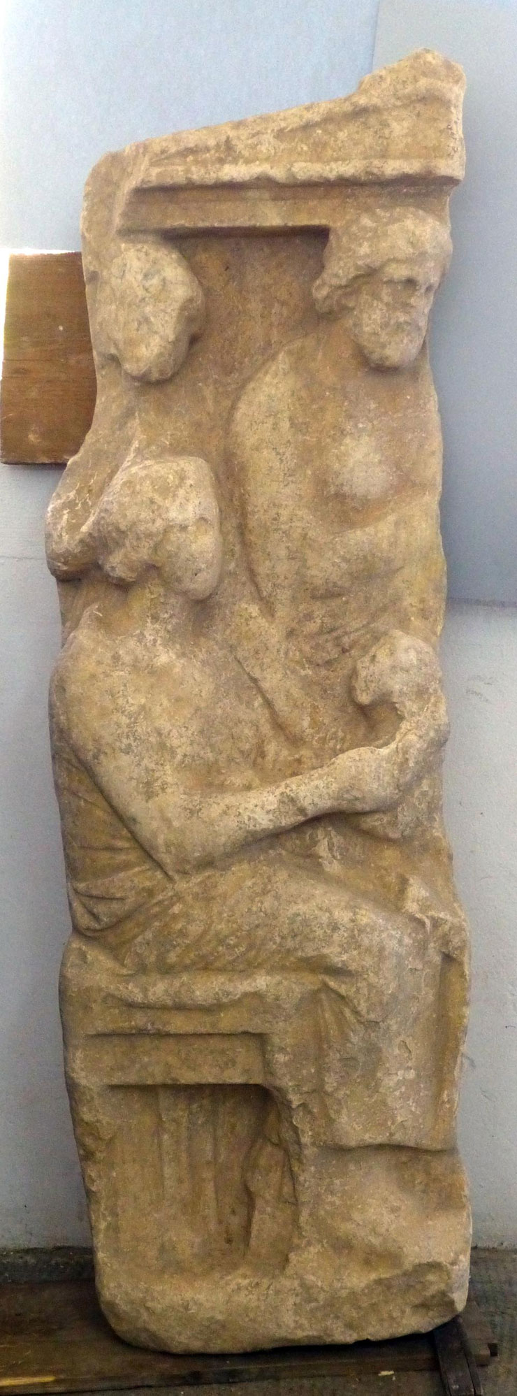 Το Ινστιτούτο αναφέρει ότι πρόκειται για ένα τμήμα επιτύμβιας στήλης. Σε αυτό υπάρχουν ευδιάκριτα ανάγλυφα μιας γυναίκας καθιστής και ενός κοριτσιού (σ.σ. σε πρώτο επίπεδο) καθώς και μιας γυναίκας με έναν γενειοφόρο άνδρα (σ.σ. σε δεύτερο επίπεδο).