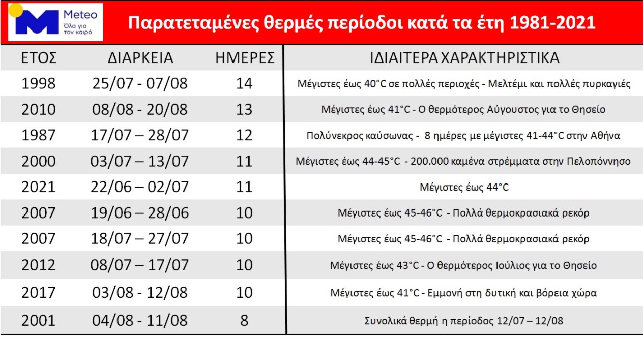 Με αφορμή τον καύσωνα που βρίσκεται σε εξέλιξη, το Εθνικό Αστεροσκοπείο Αθηνών παρουσιάζει στον παρακάτω πίνακα τους καύσωνες με μεγάλη διάρκεια που εκδηλώθηκαν την περίοδο 1981-2021. Σε αυτούς έχει συμπεριληφθεί και ο καύσωνας του Ιουνίου του 2021, ο οποίος διήρκεσε 11 ημέρες. Όπως σημειώνει το Εθνικό Αστεροσκοπείο, «είναι αντιληπτό ότι την ίδια περίοδο εκδηλώθηκαν και άλλοι καύσωνες ή έντονα θερμά επεισόδια, ωστόσο η επιλογή έγινε αποκλειστικά με κριτήριο τη διάρκεια του φαινομένου».