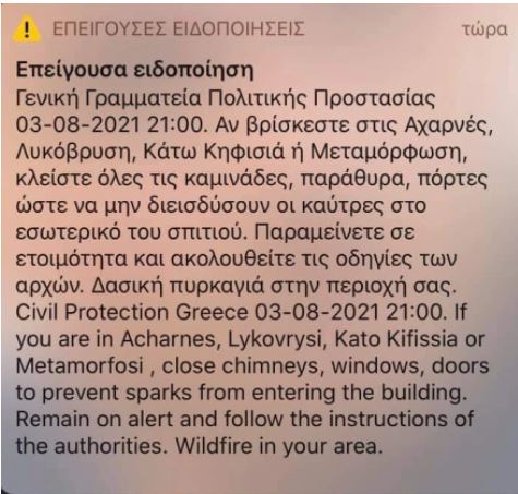 Νέο μήνυμα έστειλε το 112 στους κατοίκους των Αχαρνών, της Κάτω Κηφισιάς, της Μεταμόρφωσης και της Λυκόβρυσης.