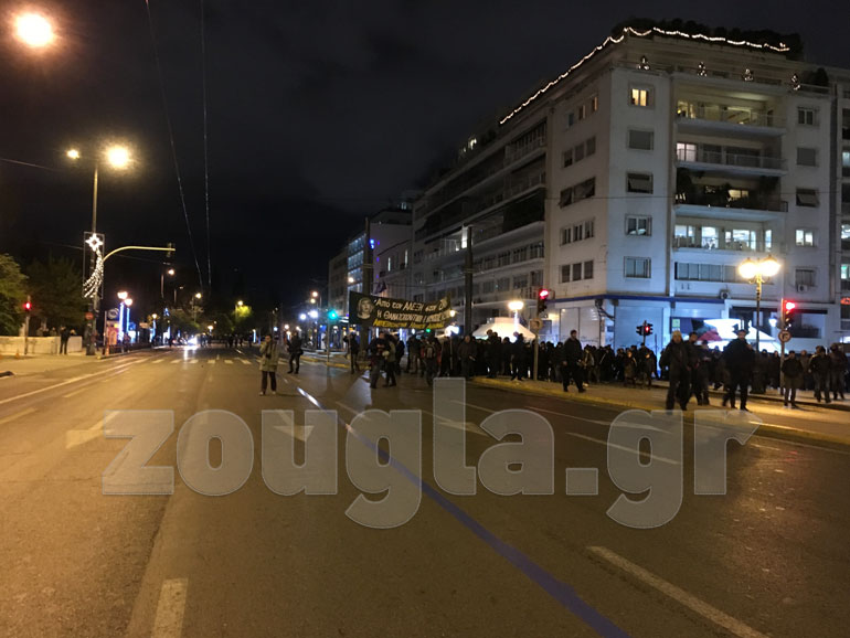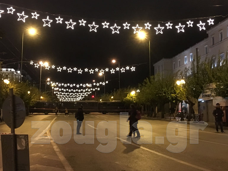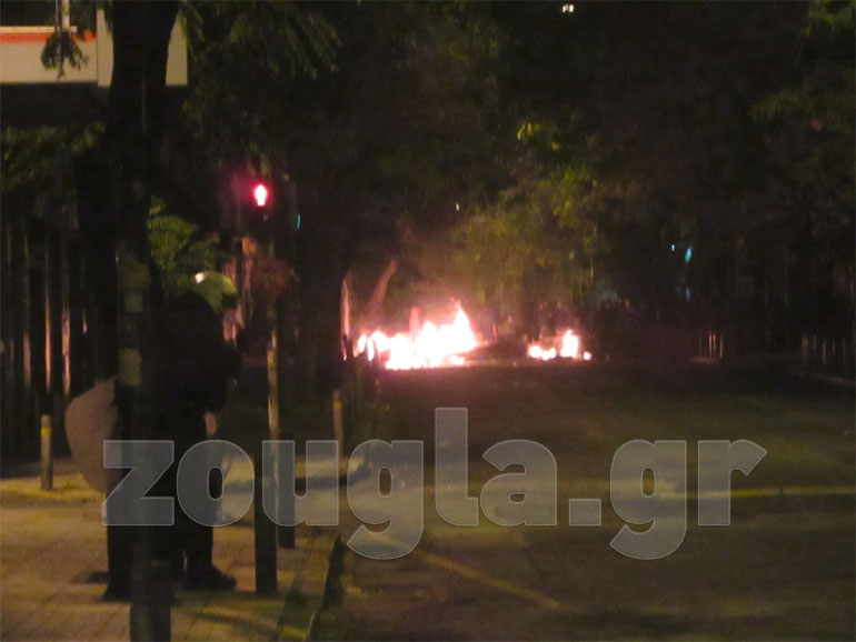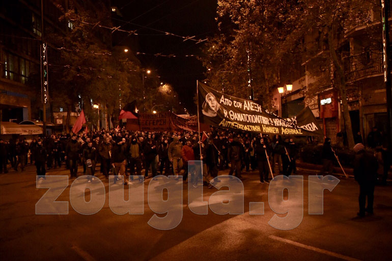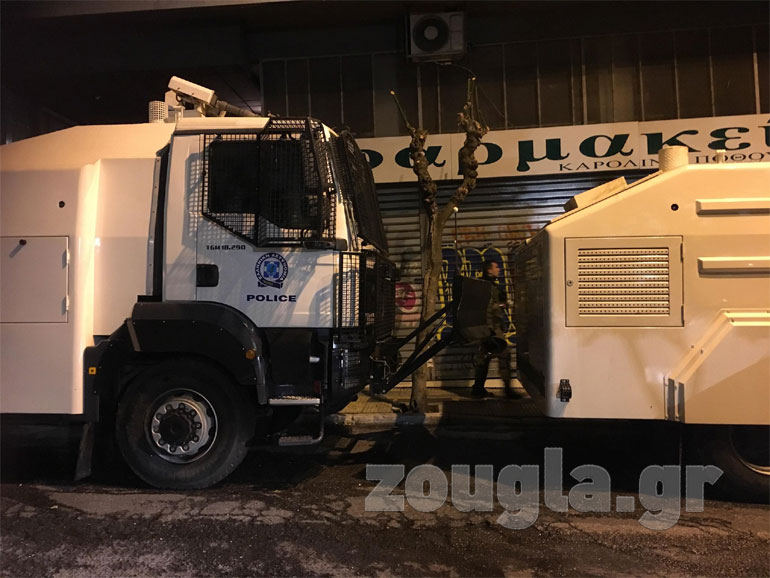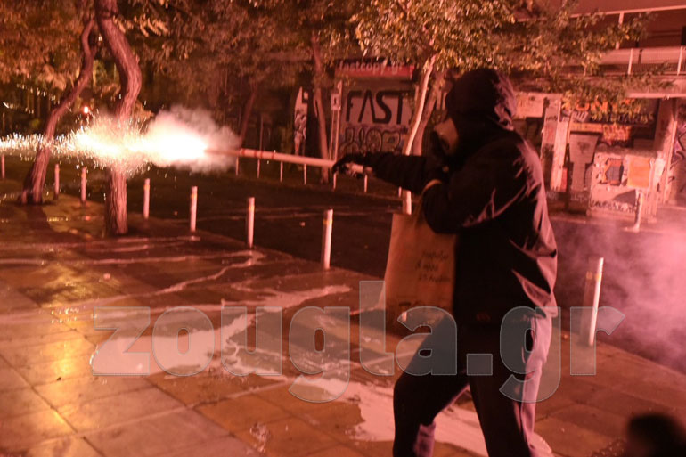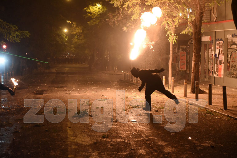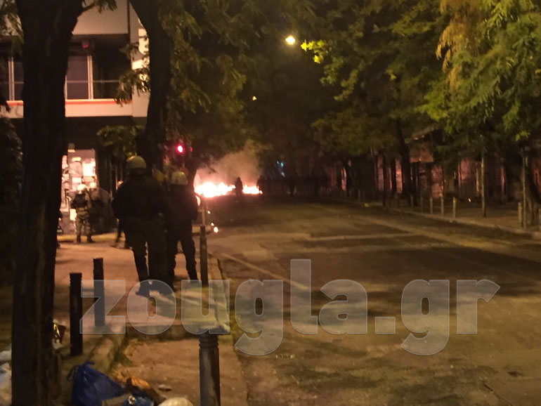 Οδοφράγματα έχουν στηθεί σε: Τοσίτσα, Νοταρά, Στουρνάρη, Θεμιστοκλέους, Μεταξά ενώ υπάρχουν μικροεστίες φωτιάς στην πλατεία Εξαρχείων. Σημειώθηκαν συγκρούσεις μεταξύ διαδηλωτών με ΜΑΤ, ενώ η αστυνομία επιστράτευσε και τα υδροφόρα οχήματα. Οι κουκουλοφόροι επιτέθηκαν με βροχή μολότοφ και πέτρες στο όχημα «Αίαντας» την ώρα που εκείνο επιχειρούσε να προσεγγίσει διαμέρισμα που απειλείτο από τις φλόγες. H δεύτερη «αύρα» κινήθηκε στην Τοσίτσα όπου γκρέμισε οδόφραγμα ύψους περίπου δύο μέτρων.