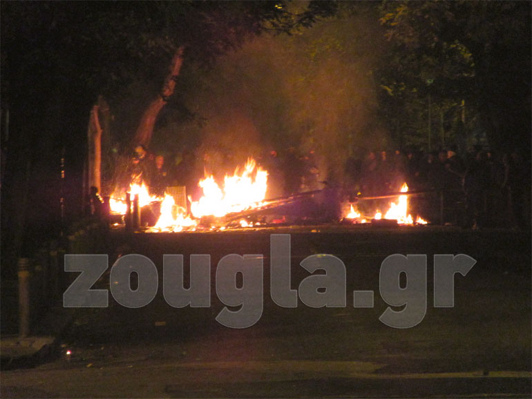 Νωρίτερα, περίπου στις 17:00 άρχισαν να ανάβουν οι πρώτες φωτιές στους δρόμους των Εξαρχείων, ενώ λίγο μετά τις 18.30 στήθηκαν πύρινα οδοφράγματα.