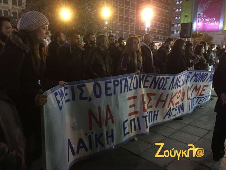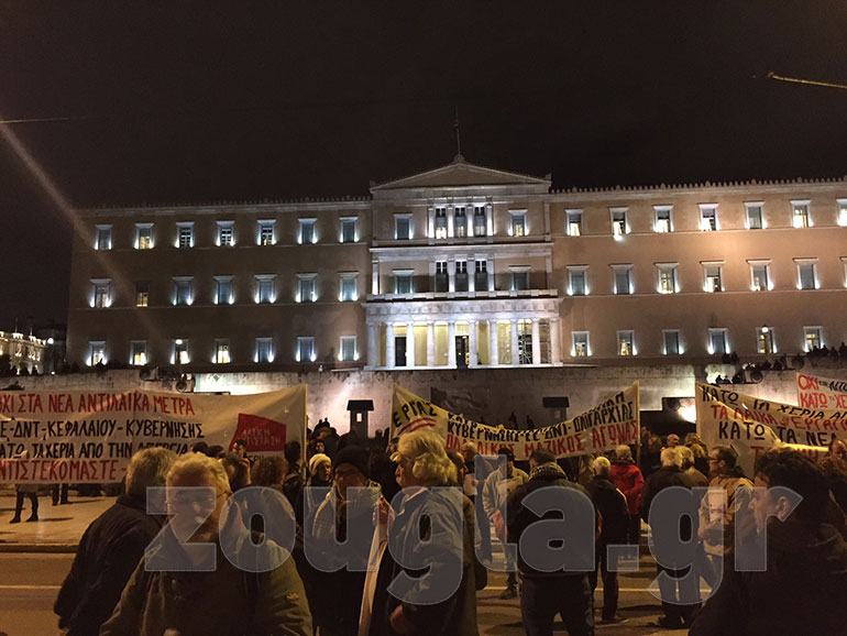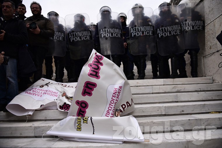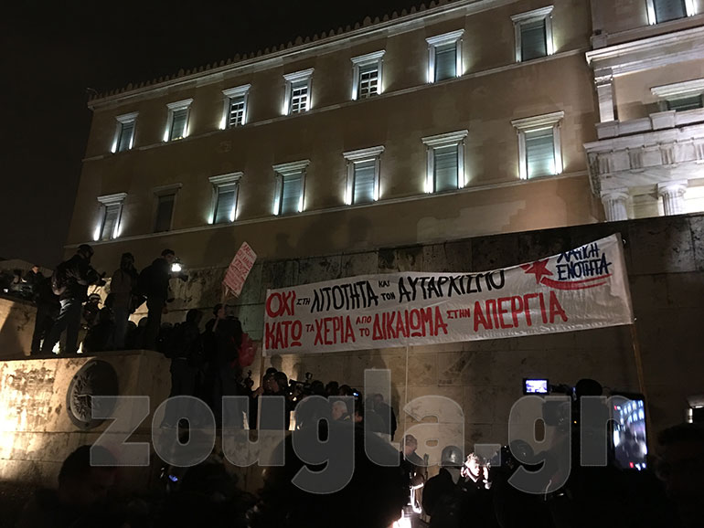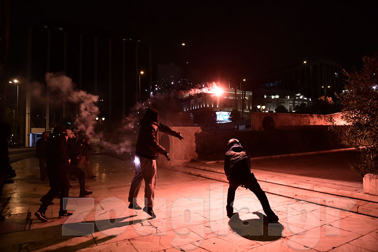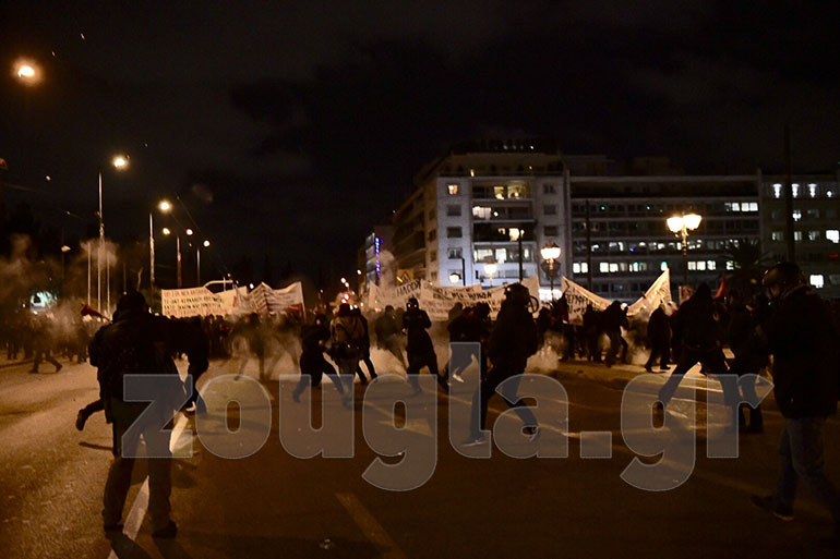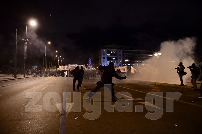 Επεισόδια μεταξύ διαδηλωτών και αστυνομίας σημειώθηκαν λίγο μετά τις 19.00 μπροστά από τη Βουλή. Συγκεκριμένα, κάποιοι διαδηλωτές προσπάθησαν να πλησιάσουν τα σκαλιά μπροστά από το μνημείο του Αγνώστου Στρατιώτη, με αποτέλεσμα οι αστυνομικές δυνάμεις να κάνουν χρήση χημικών. Παράλληλα οι διαδηλωτές πέταξαν μπογιές.
