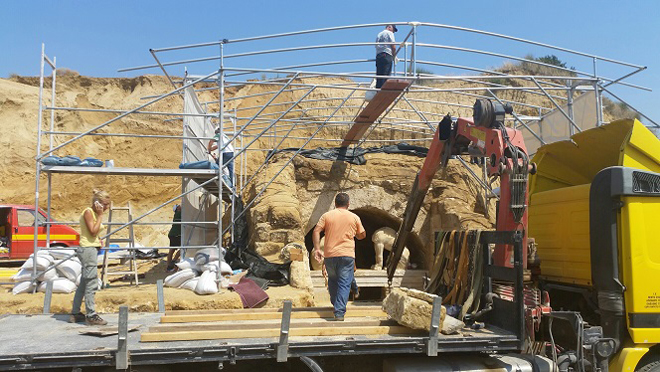 Παράλληλα με την πρόοδο της ανασκαφικής έρευνας δημιουργούνται οι εργοταξιακές υποδομές, που θα εξασφαλίσουν καλύτερες συνθήκες εργασίας στους εργαζόμενους και ασφαλέστερη προστασία στο ταφικό μνημείο από τις καιρικές συνθήκες. Σήμερα, ολοκληρώθηκε και η τοποθέτηση του προσωρινού στεγάστρου, που καλύπτει εξωτερικά το μνημείο.