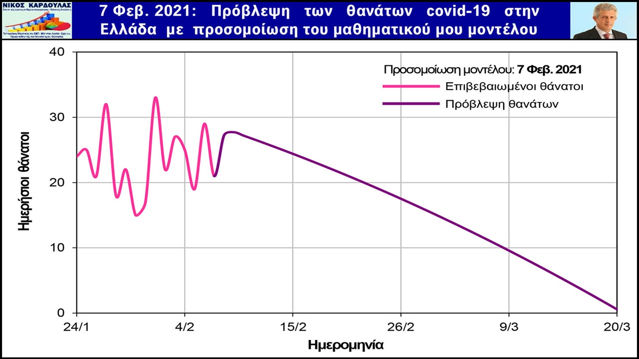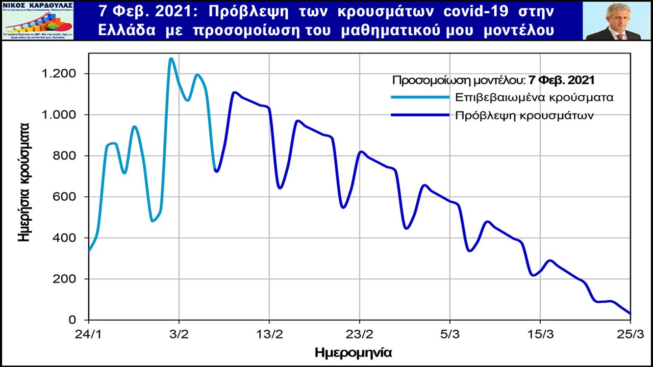 Ενσωματώνοντας στο μαθηματικό μοντέλο τα επιδημιολογικά δεδομένα της περασμένης εβδομάδας από 1 έως 7 Φεβρουαρίου και με σχετική προσομοίωση προέκυψαν τα παρακάτω τρία γραφήματα από τα οποία προκύπτει: