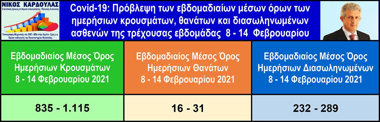 Για τους παραπάνω λόγους, ασφαλής πρόβλεψη μπορεί να γίνει μόνο για τις επόμενες 7 ημέρες και στον παρακάτω πίνακα απεικονίζονται οι προβλέψεις του μοντέλου για τους εβδομαδιαίους μέσους όρους των ημερήσιων κρουσμάτων, θανάτων και διασωληνωμένων ασθενών της τρέχουσας εβδομάδας από 8 έως 14 Φεβρουαρίου 2021.