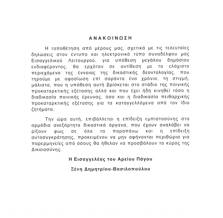 «Η τοποθέτηση από μέρους μας, σχετικά με τις τελευταίες δηλώσεις στον έντυπο και ηλεκτρονικό Τύπο, συναδέλφου μας εισαγγελικού λειτουργού, για υπόθεση μεγάλου δημόσιου ενδιαφέροντος, θα ερχόταν σε αντίθεση με το ελάχιστο περιεχόμενο της έννοιας της δικαστικής δεοντολογίας, που τηρούμε με αφοσίωση επί σαράντα ένα χρόνια, τη στιγμή μάλιστα, που η υπόθεση αυτή βρίσκεται στο στάδιο της ποινικής προκαταρκτικής εξέτασης, αλλά και που έχει ήδη κινηθεί, τόσο η διαδικασία ποινικής έρευνας, όσο και η διαδικασία πειθαρχικής προκαταρκτικής εξέτασης για τα καταγγελλόμενα από τον ίδιο ζητήματα.