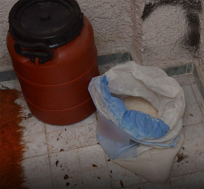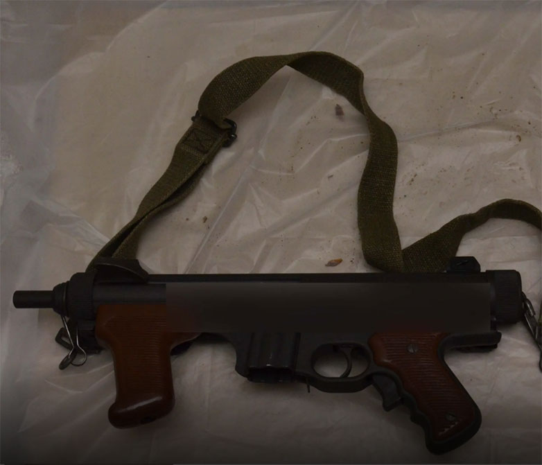 3 χειροβομβίδες, υποπολυβόλο, 6 πυροβόλα όπλα, διάφορα μέρη όπλων, γεμιστήρες και πλήθος φυσιγγίων, 25 πυροκροτητές, 7,5 κιλά αμμωνιοδυναμίτιδας, 3 κιλά ζελατοδυναμίτιδας,