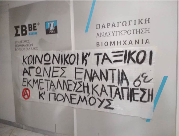 Ο Σύνδεσμος Βιομηχανιών Βορείου Ελλάδος είναι μια από τις εργοδοτικές ενώσεις που έχουν πρωτοστατήσει στην επίθεση των αφεντικών ενάντια στην εργατική τάξη. Για αυτόν τον λόγο, σήμερα Πέμπτη 6/9/2018 αποφασίσαμε να παρέμβουμε στα κεντρικά γραφεία του για να υπενθυμίσουμε πως όσες επικοινωνιακές φανφάρες κι αν επινοήσει το πολιτικό προσωπικό της κυριαρχίας, ο ΣΒΒΕ ήταν, είναι και θα παραμείνει ένας από τους βασικούς ταξικούς μας εχθρούς.