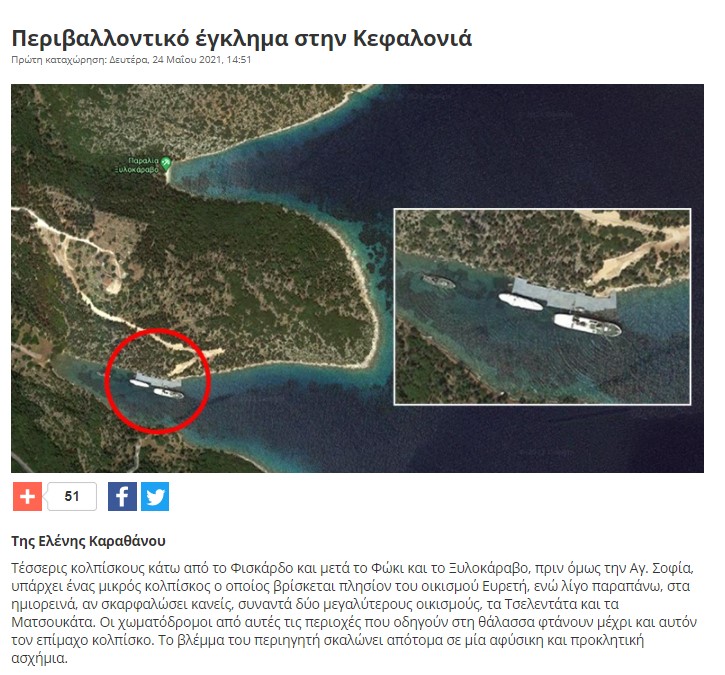 Να σημειωθεί ότι τοπικές πηγές μας κατήγγειλαν πως από τον συγκεκριμένο κόλπο ξεκινάει και το υποβρύχιο καλώδιο των οπτικών ινών το οποίο καταλήγει στην Ιθάκη. Σύμφωνα με τις ίδιες πηγές είναι παράνομο να υπάρχει υποβρύχιο καλώδιο σε αγκυροβόλιο. Μάλιστα μας επεσήμαναν πως για να γίνει αυτό, ο εφοπλιστής επιστράτευσε δύτες προκειμένου να διευκολύνουν την εταιρεία που πέρασε τις οπτικές ίνες στο έργο της.