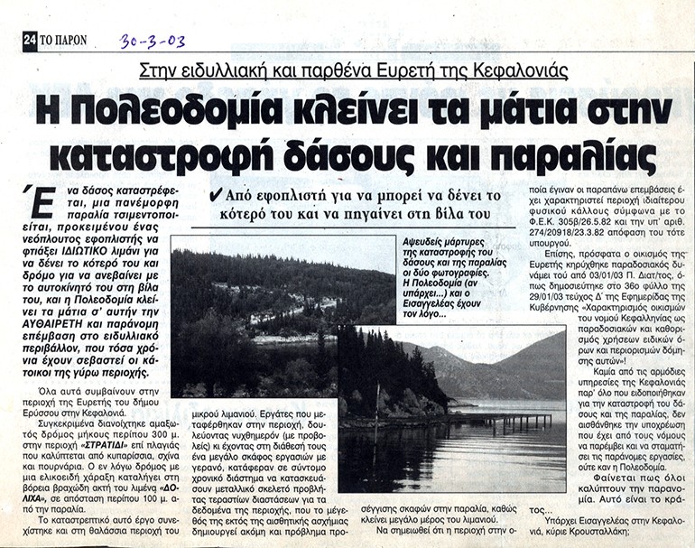 Πολλές εφημερίδες αναφέρονται τότε στη συγκεκριμένη υπόθεση κάνοντας λόγο για καταστροφή του δάσους αλλά και τσιμεντοποίηση μιας παραλίας από έναν εφοπλιστή ο οποίος θέλει να δένει το κότερό του δίπλα στη βίλα του. Χαρακτηριστικό παράδειγμα, η εφημερίδα «Το Παρόν», η οποία με δημοσίευμα στις 30/3/2003 στοχοποιεί την Πολεοδομία.