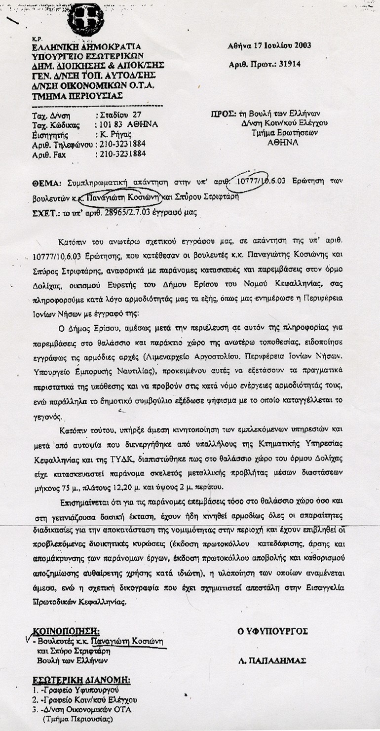 Η υπόθεση του εφοπλιστή φτάνει μέχρι και τη Βουλή, με ερωτήσεις βουλευτών. Εξαιρετικό ενδιαφέρον έχει το παρακάτω έγγραφο στο οποίο προκύπτει πως από την αυτοψία της Κτηματικής Υπηρεσίας η παράνομη προβλήτα έχει μήκος 75 μέτρα, πλάτος 12,20 μέτρα και ύψος δύο μέτρα. Να σημειωθεί εδώ πως πρόκειται για αυτοψία που έγινε το 2003. Εάν γίνει σήμερα αυτοψία, κάποιες διαστάσεις μπορεί να είναι διαφορετικές.