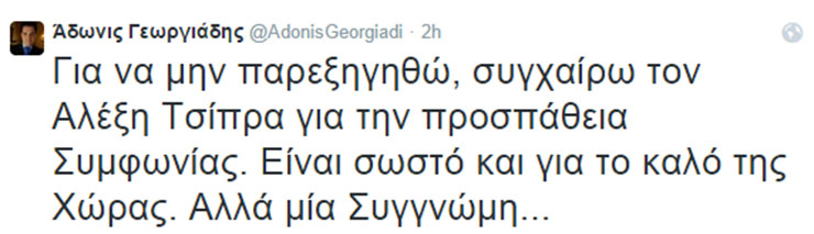 Τα συγχαρητήριά του στον Αλέξη Τσίπρα εκφράζει μέσω Twitter ο Άδωνις Γεωργιάδης ζητώντας παράλληλα μια συγγνώμη.