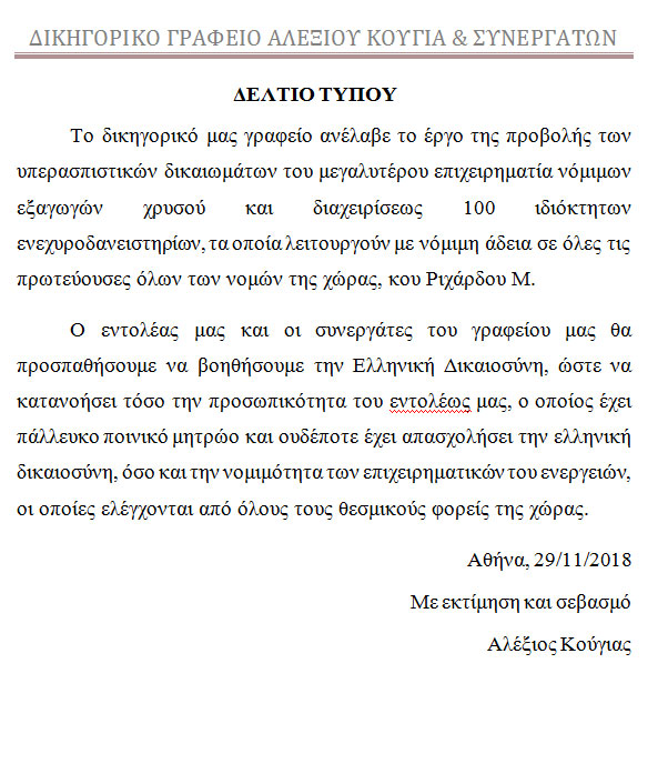 Σε δελτίο Τύπου από το δικηγορικό γραφείο αναφέρονται τα εξής: