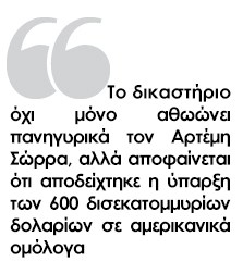 Το δικαστήριο όχι μόνο αθωώνει πανηγυρικά τον Αρτέμη Σώρρα, αλλά αποφαίνεται ότι αποδείχτηκε η ύπαρξη των 600 δισεκατομμυρίων δολαρίων σε αμερικανικά ομόλογα.