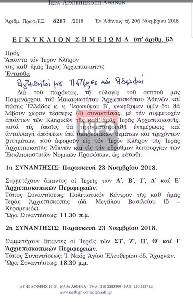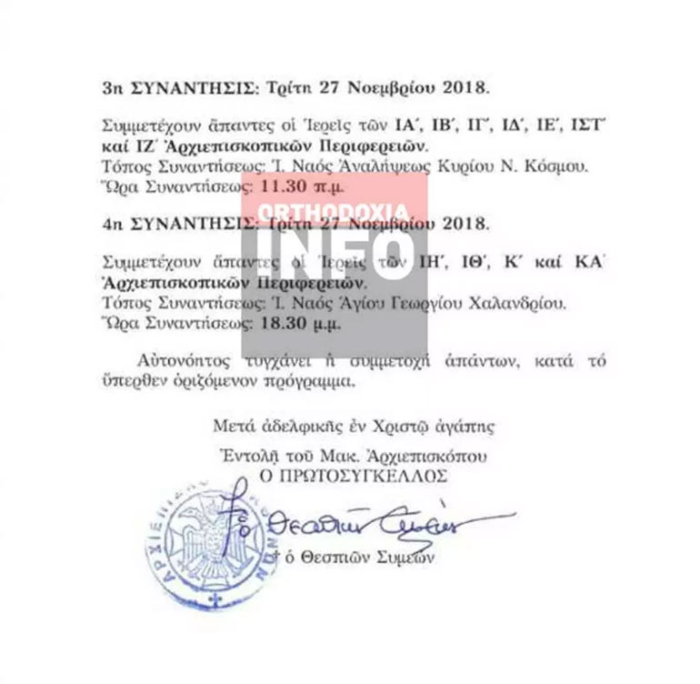 Τέσσερις ενημερωτικές συναντήσεις για τους κληρικούς της Αρχιεπισκοπής Αθηνών θα πραγματοποιήσει στις 23 και 27 Νοεμβρίου ο Αρχιεπίσκοπος Ιερώνυμος.