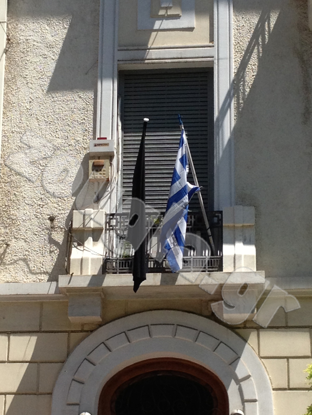 Πριν από λίγο ο γνωστός σκηνοθέτης Δημήτρης Κολλάτος κρέμασε μια μαύρη σημαία στο μπαλκόνι του σπιτιού του, απέναντι από τη γερμανική πρεσβεία.