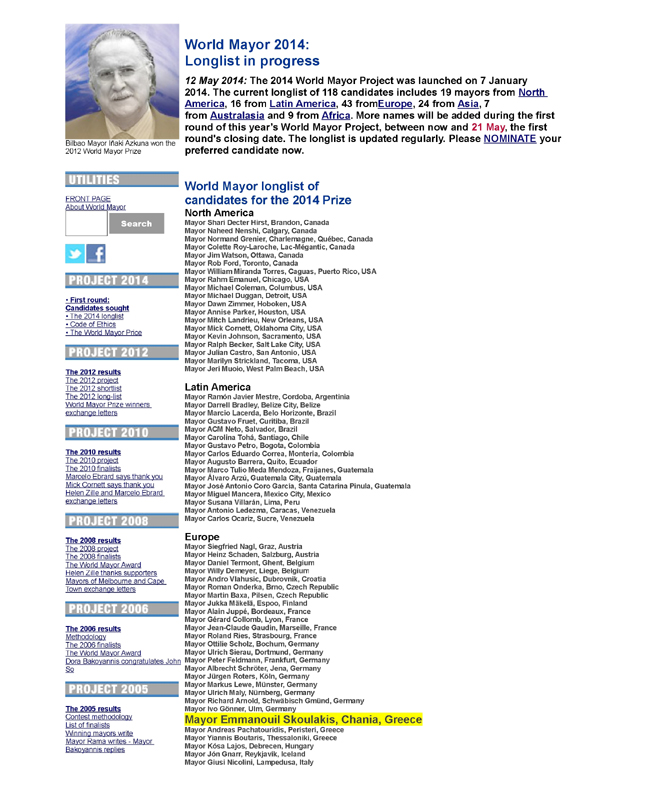 Μεταξύ των εκπροσώπων του Α΄ βαθμού της Τοπικής Αυτοδιοίκησης, που επελέγησαν να συμμετάσχουν στον παγκόσμιο διαγωνισμό για την ανάδειξη του «Καλύτερου Δημάρχου του Κόσμου» για το 2014 (World Mayor 2014) περιλαμβάνεται ο Δήμαρχος Χανίων, Μανώλης Σκουλάκης, όπως γνωστοποιείται στον επίσημο ιστότοπο του παγκόσμιου διαγωνισμού «The 2014 World Mayor Project».
