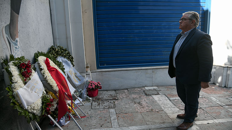 Ο Δημήτρης Κουτσούμπας στην κατάθεση στεφανιού στη Marfin για τη συμπλήρωση των 10 χρόνων από το θάνατο τριών εργαζόμενων της τράπεζας καθώς και ενός αγέννητου παιδιού, ανέφερε μεταξύ άλλων: