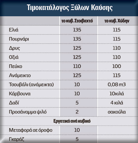 Η «χρηματιστηριακή» αξία του κυβικού ξύλων θέρμανσης παραμένει ακόμη στα περυσινά περίπου επίπεδα και διαμορφώνεται ανάλογα με την ποιότητα και τη διάθεση του σε «στοιβαχτό» ή «χύδην». Ενδεικτικά, στην περιοχή του Χαλανδρίου το κυβικό (χύδην) ελιάς πουρνάρι ανέρχεται στα 115 ευρώ, στα 110 ευρώ η οξιά και το πεύκο και 115 ευρώ το κυβικό στα ανάμεικτα, ενώ όσοι επιλέξουν «στοιβαχτό» κυβικό θα πρέπει να πληρώσουν 10-20 ευρώ περισσότερα.