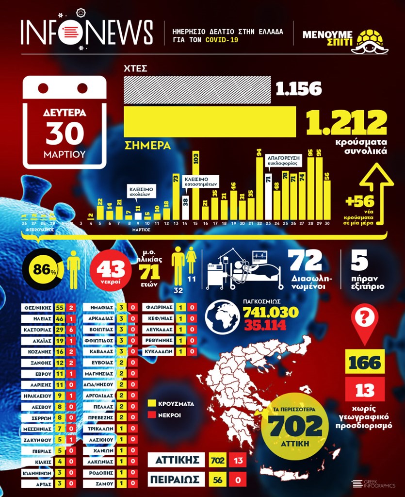 Δείτε στο infographic που ακολουθεί την αναλυτική χαρτογράφηση των κρουσμάτων του κορωνοϊού στη χώρα μας, έπειτα από την επίσημη ενημέρωση των Αρχών, το απόγευμα της Δευτέρας 30 Μαρτίου.