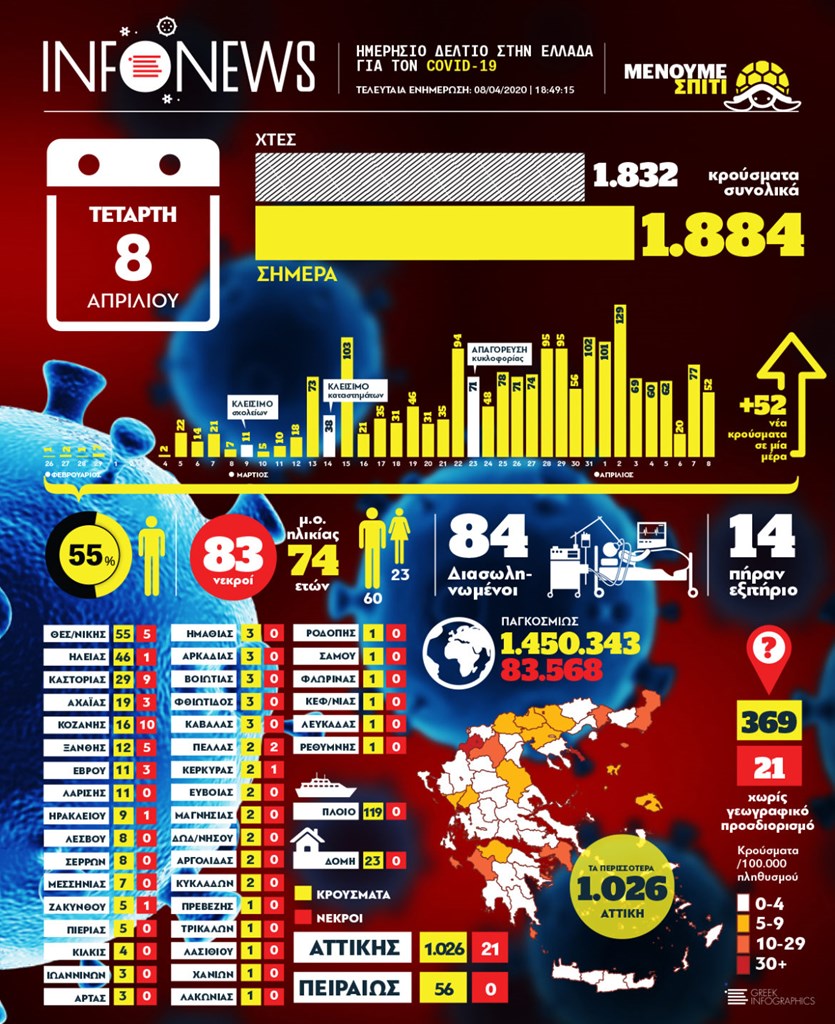 Δείτε στο infographic που ακολουθεί την αναλυτική χαρτογράφηση των κρουσμάτων του κορωνοϊού στη χώρα μας, έπειτα από την επίσημη ενημέρωση των Αρχών, το απόγευμα της Τετάρτης 8 Απριλίου.