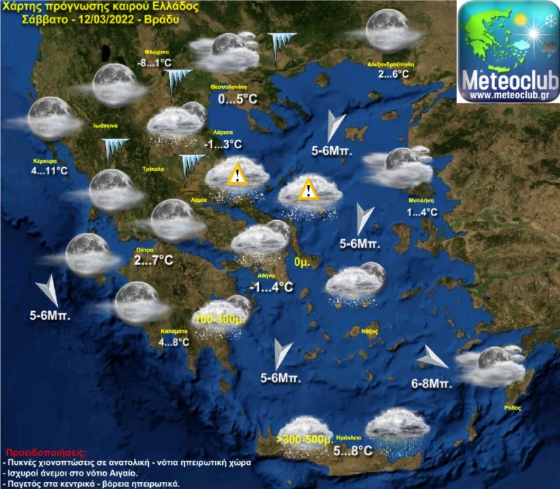 Καταιγίδες θα εκδηλωθούν ξανά στις Νότιες Κυκλάδες και στη Βόρεια Κρήτη, ενώ πυκνές χιονοπτώσεις θα εκδηλωθούν στα ορεινά – ημιορεινά και κατά τόπους και πεδινά τμήματα της Βόρειας Κρήτης.