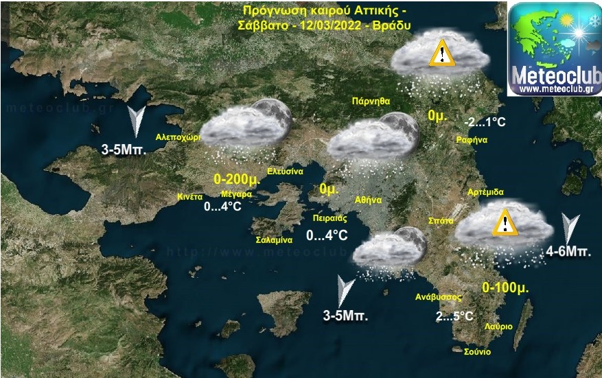 Από τις πρώτες βραδινές ώρες σταδιακά τα φαινόμενα στα κεντρικά και δυτικά τμήματα της Αττικής θα αρχίσουν να εξασθενούν και θα περιοριστούν στα ανατολικά και βόρεια του νομού, όπου έως και αργά τη νύχτα θα εκδηλώνονται χιονοπτώσεις. Επίσης, υπάρχει πιθανότητα ασθενών τοπικών χιονοπτώσεων στα ανατολικά και βόρεια προάστια του Λεκανοπεδίου.