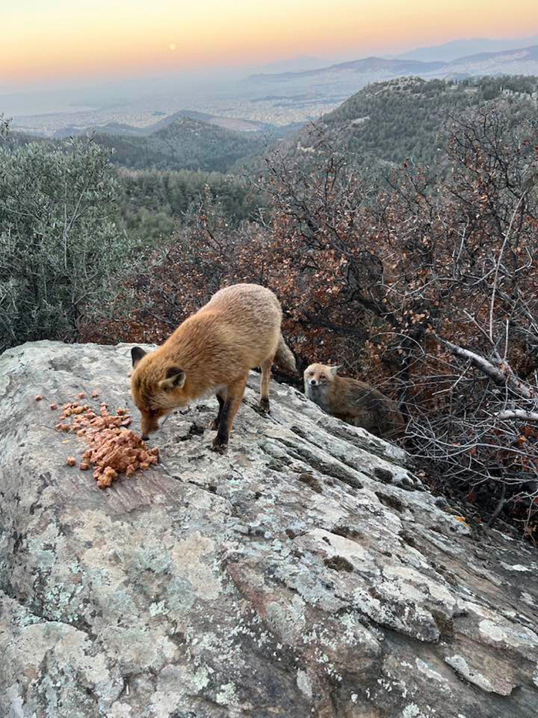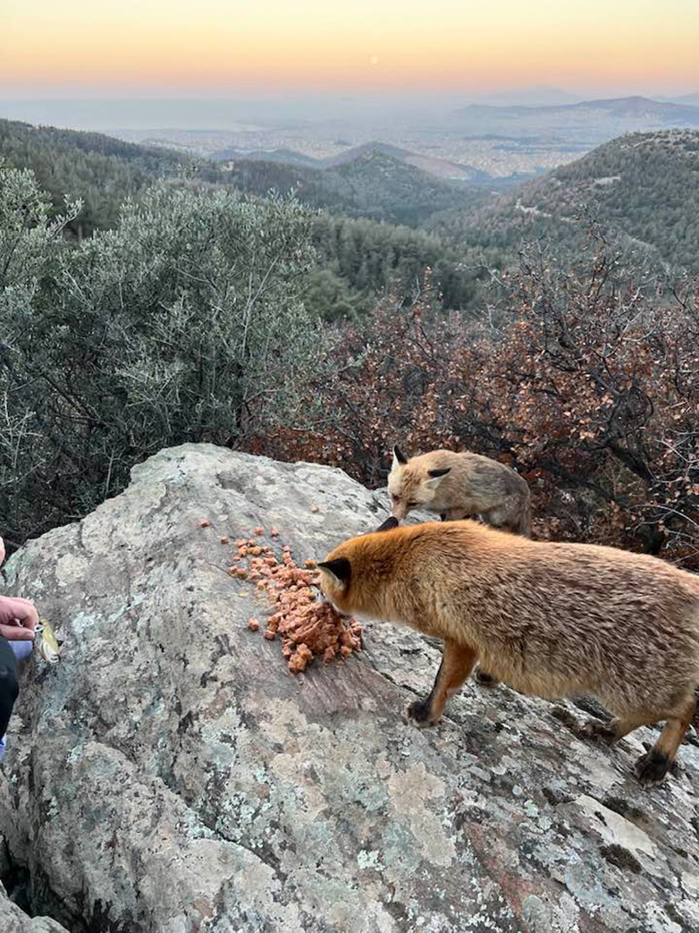 Ο κ. Κώστας Βερτόπουλος έχει αναπτύξει την καθημερινή συνήθεια να προσφέρει φαγητό, όχι σε σκυλάκια ή γατάκια, αλλά σε μερικές ελεύθερες αλεπούδες.