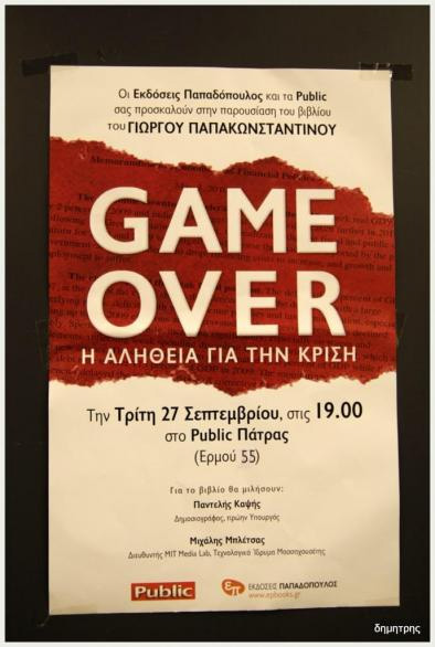 Πλήθος κόσμου βρέθηκε χθες το βράδυ στον χώρο του βιβλιοπωλείου Public στην Πάτρα, όπου πραγματοποιήθηκε η παρουσίαση του βιβλίου του πρώην υπουργού Οικονομικών Γιώργου Παπακωνσταντίνου με τίτλο «Game Over, Η Αλήθεια για την κρίση».