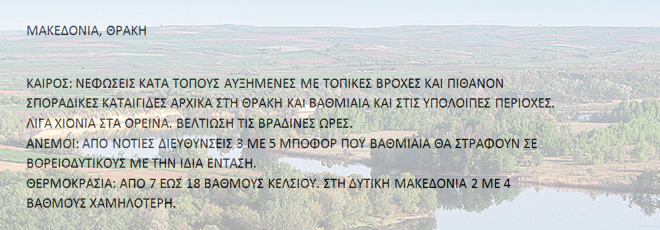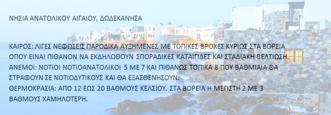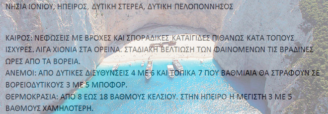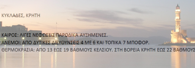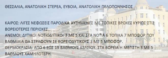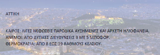 Η θερμοκρασία θα κυμανθεί από 5 έως 19 βαθμούς στη Βόρεια Ελλάδα, από 6 έως 19 βαθμούς στην Κεντρική Ελλάδα, από 10 έως 21 βαθμούς στη Νότια Ελλάδα, από 8 έως 19 βαθμούς στη Δυτική Ελλάδα και από 14 έως 19 βαθμούς στα νησιά του Αιγαίου και την Κρήτη. Ηλιοφάνεια, περιμένουμε την Παρασκευή στην Αττική. Η θερμοκρασία στο κέντρο θα φτάσει τους 20 βαθμούς Κελσίου. Οι άνεμοι θα πνέουν νοτιοδυτικοί σχεδόν μέτριοι έως μέτριοι στρεφόμενοι το βράδυ σε βορειοδυτικούς με την ίδια ένταση.
