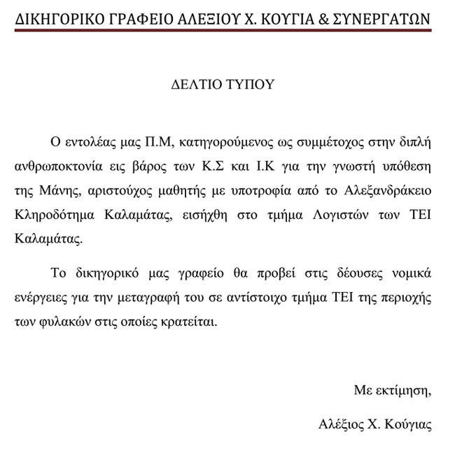 Ο δικηγόρος του δεύτερου, Αλέξης Κούγιας, εξέδωσε σήμερα ανακοίνωση σύμφωνα με την οποία σκοπεύει να προβεί σε όλες τις απαραίτητες ενέργειες προκειμένου ο πελάτης του να μετεγγραφεί σε αντιστοιχο τμήμα ΤΕΙ, κοντά στις φυλακές.