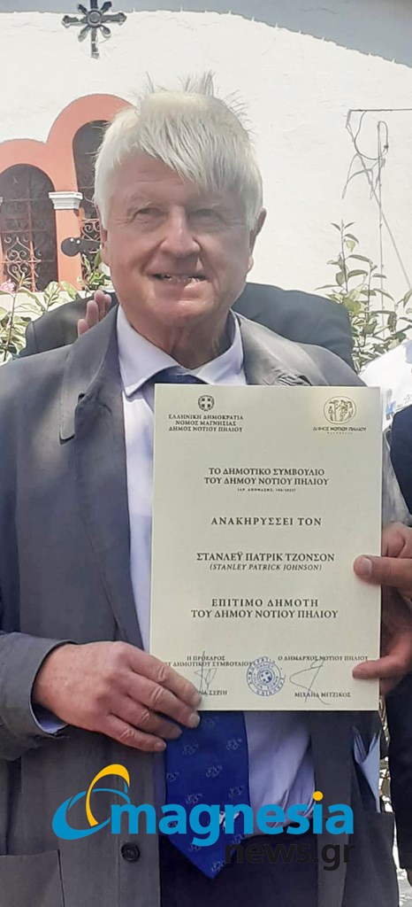 Στον κ. Τζόνσον δόθηκε ειδική πλακέτα, αλλά και το ψήφισμα του δημοτικού συμβουλίου που τον ανακήρυξε επίτιμο δημότη Νοτίου Πηλίου.