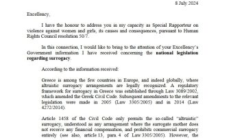 «Παρακολουθώ με ανησυχία την παντελή απουσία επιτήρησης, πρόληψης, διωκτικού μηχανισμού και τιμωρίας παράνομων πρακτικών που φέρονται να έχουν οδηγήσει σε κατάφορη παραβίαση των ανθρωπίνων δικαιωμάτων των παρένθετων μητέρων και των παιδιών που κυοφόρησαν» αναφέρει η επιστολή προς τον Έλληνα Πρωθυπουργό με την κα Alsalem να διαπιστώνει έλλειψη εποπτείας των ιδιωτικών κλινικών υποβοηθούμενης αναπαραγωγής που υλοποιούν προγράμματα παρένθετης μητρότητας, τους κινδύνους για τη ζωή και την υγεία των γυναικών, την έλλειψη ή την ανεπαρκή εξέταση του συμφέροντος του παιδιού, τους πιθανούς δεσμούς των κλινικών αυτών με τα κυκλώματα εμπορίας ανθρώπων».