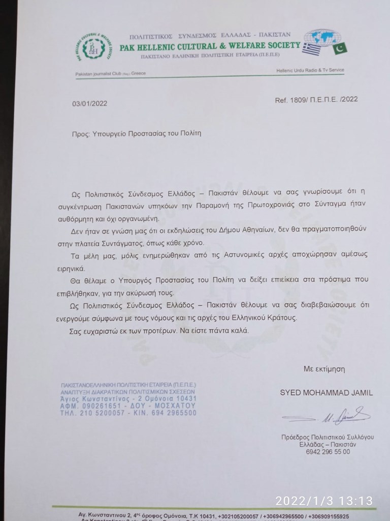 «Ως Πολιτιστικός Σύνδεσμος Ελλάδος – Πακιστάν, θέλουμε να σας γνωρίσουμε ότι η συγκέντρωση Πακιστανών υπηκόων την Παραμονή της Πρωτοχρονιάς στο Σύνταγμα ήταν αυθόρμητη και όχι οργανωμένη.