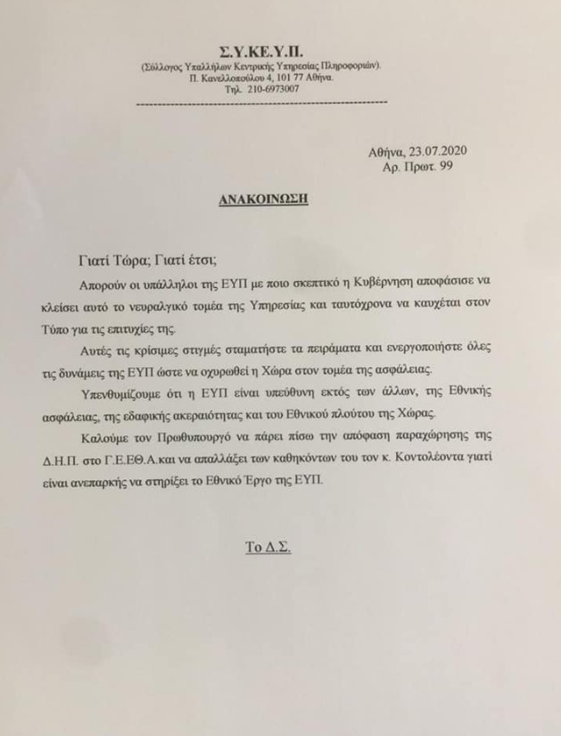 Ο ίδιος προσθέτει ότι «ο σύλλογος υπαλλήλων της Κεντρικής Υπηρεσίας Πληροφοριών, απαιτεί από τον πρωθυπουργό την αποπομπή του διοικητή της ΕΥΠ, κ. Κοντολέοντα λόγω ανεπάρκειας».